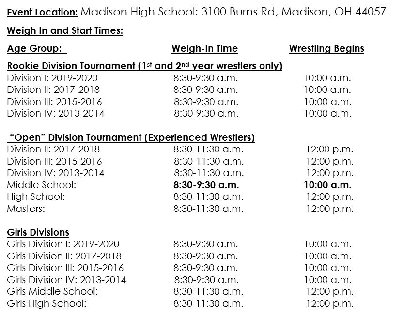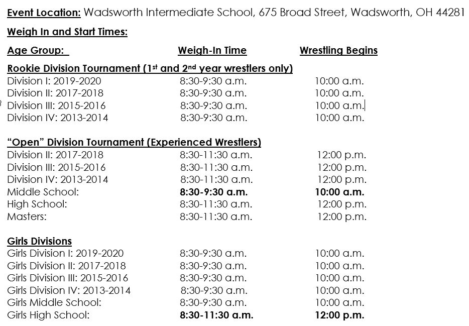 3. In some cases, your wrestler may be a first- or second-year wrestler, but if your wrestler has gotten a tremendous amount of mat time in that time or maybe just demonstrated an extremely aptitude for the sport (which is a great thing) it may be time to move up to the Open Division. For instance, if you find that your wrestler is pinning and tech falling their way through brackets multiple weeks in a row, it is likely time to move up. Thank you to all for your cooperation and efforts in making our great sport as fair as possible!